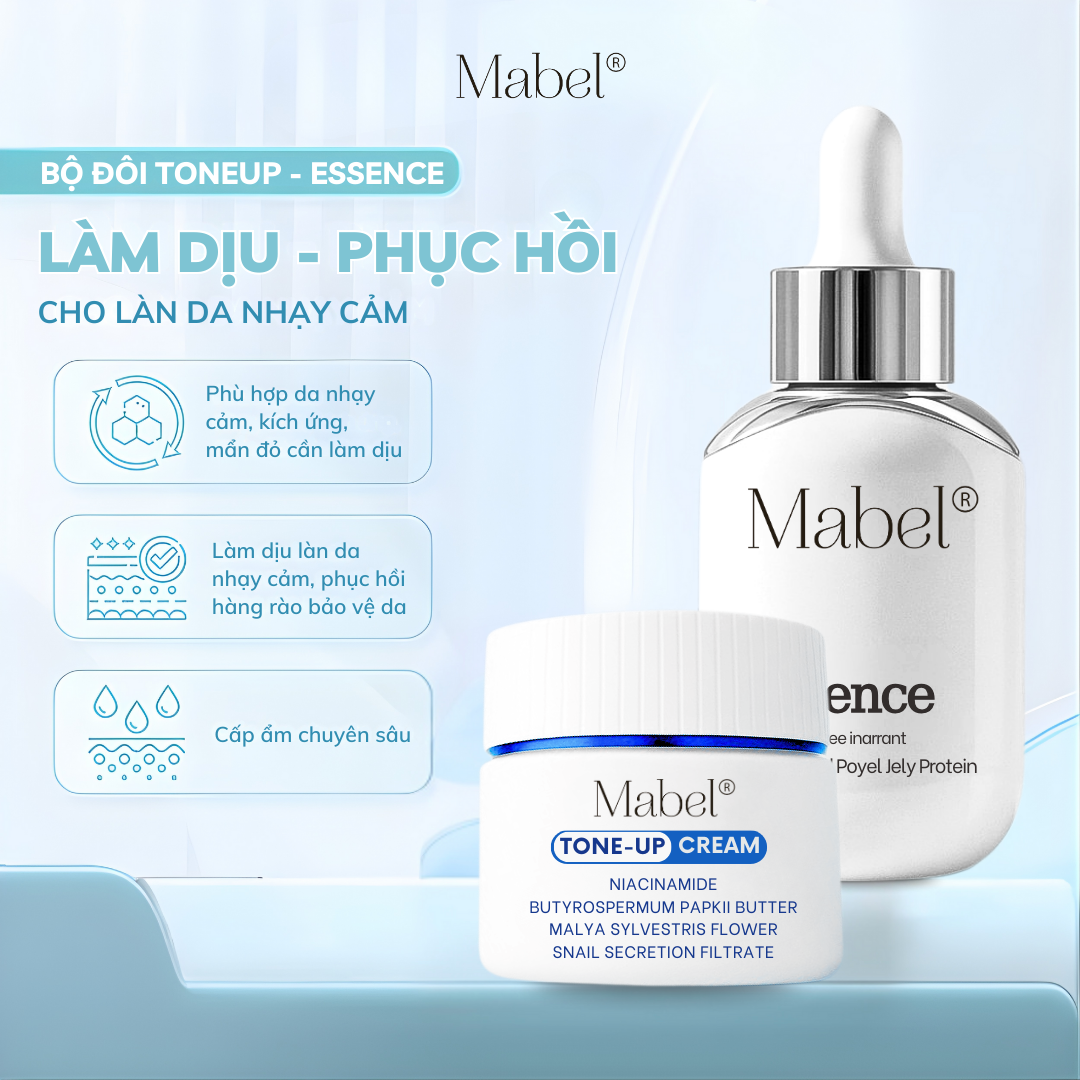 Chính vì sự “khó tính” của làn da nhạy cảm, việc lựa chọn sản phẩm phù hợp trở thành yếu tố quyết định. Thay vì chạy theo những hoạt chất mạnh hoặc trào lưu dưỡng da phức tạp, điều mà da nhạy cảm cần nhất là một quy trình đơn giản – lành tính – hỗ trợ phục hồi hàng rào bảo vệ da mỗi ngày. Nhận thấy điều đó, Mabel đã nghiên cứu và kết hợp hai sản phẩm chủ lực của mình: Mabel EssenceTone-Up Cream, tạo thành bộ đôi chăm sóc da lý tưởng, vừa làm dịu, vừa phục hồi, vừa tăng ẩm, lại vừa cải thiện tone da một cách an toàn, phù hợp cho cả những làn da dễ kích ứng nhất.
